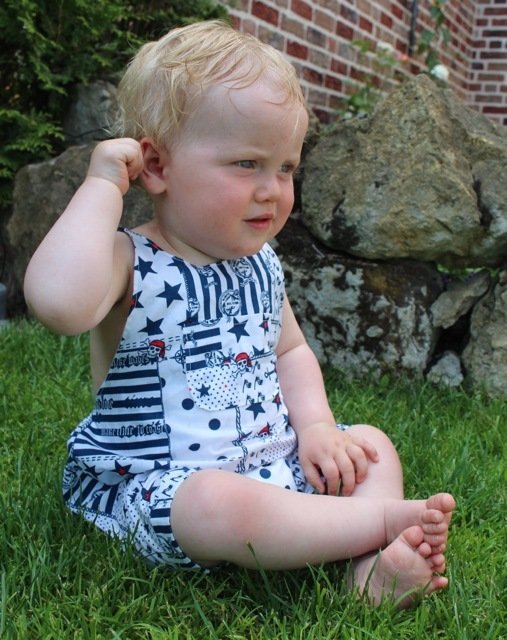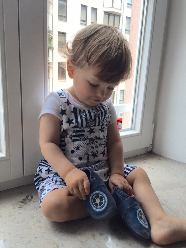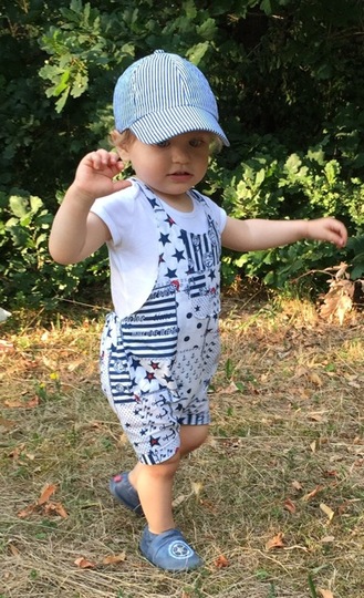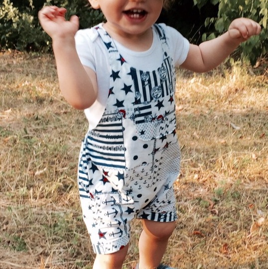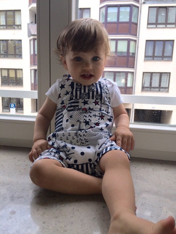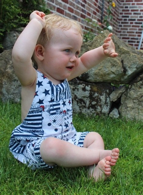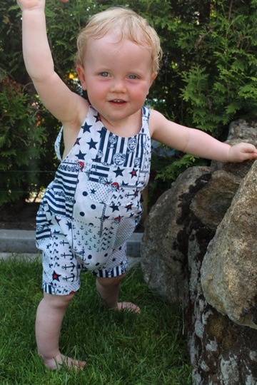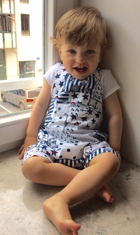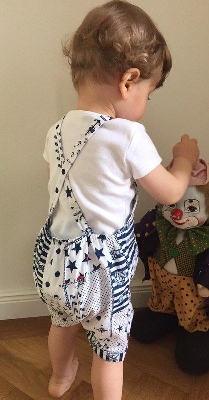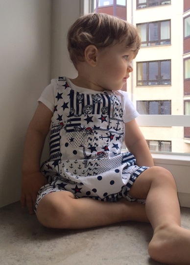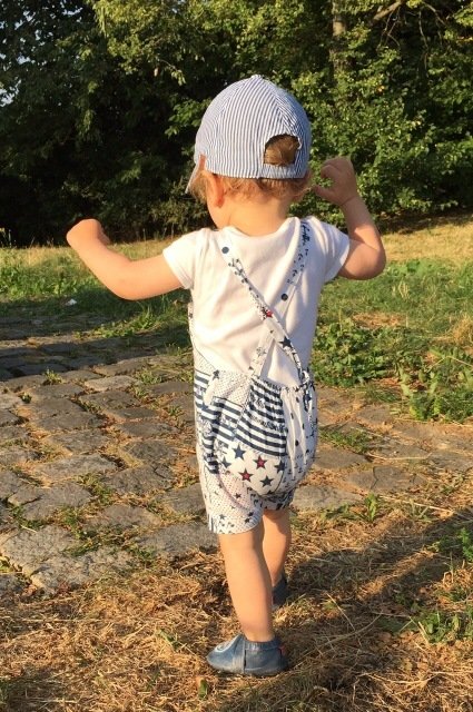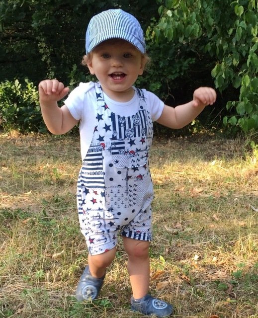 This cute trouser / overall suit for warm days can be sewn from cotton or jersey. Actually all fabrics are possible. The advantage of jersey is that you will not need any buttons because it is stretchy and put on very easily. The suit is easy to sew, also for beginners. Your child can wear this suit for a long time, depending on the weather just add a body for beneath. JANNEs suit also looks really pretty sewn from baby cord.