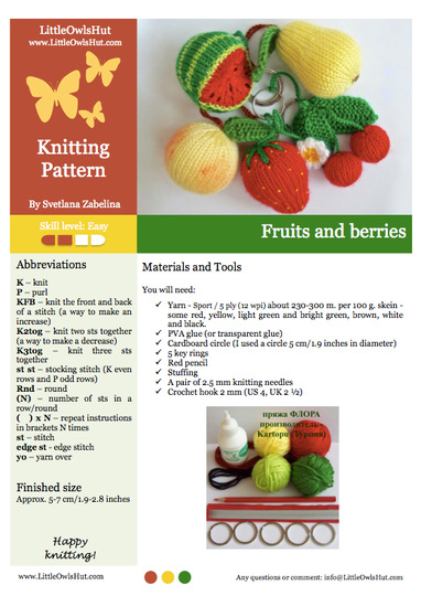 • Yarn - Sport / 5 ply (12 wpi) about 230-300 m. per 100 g. skein - some red, yellow, light green and bright green, brown, white and black.