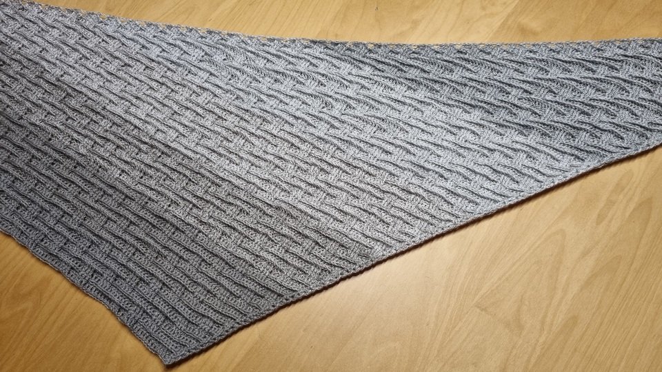 1200m/3-ply yarn and hook size 3,0 results in a shawl with the sizes 1,75 m x 0,45 m