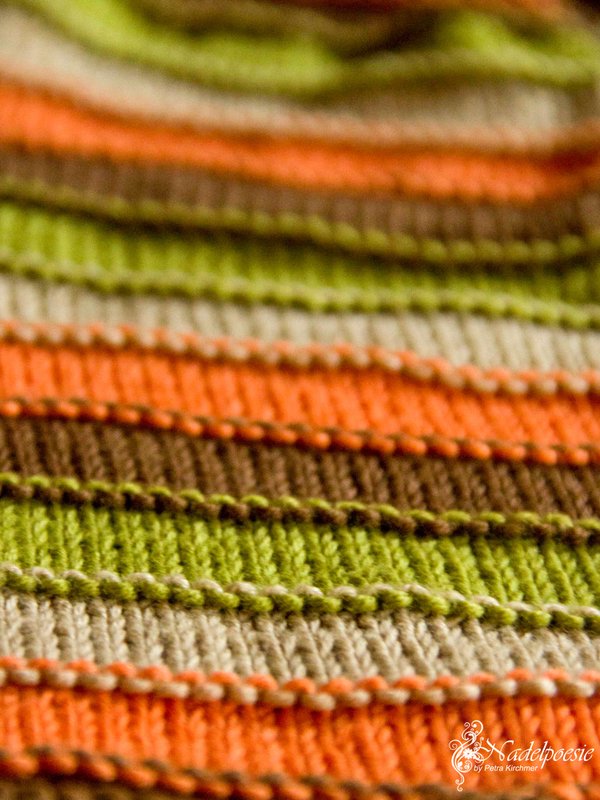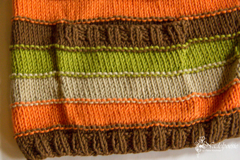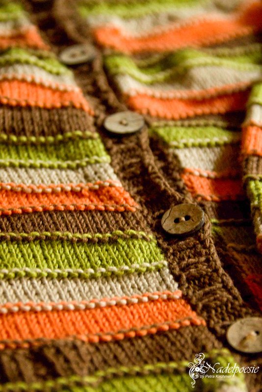 Die Jacke wird zunächst am Körper begonnen und dann mit den Ärmeln zusammengestrickt. Danach wird in einem Stück bis zum Halsausschnitt gestrickt.