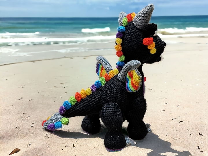 The finished dragon will be about 25cm. Of course, the size can vary depending on whether you crochet tight or loose. The choice of wool is also important. I crochet with cotton yarn 4ply 125m/50g (100% cotton).